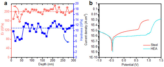 (a) Mechanical and (b) corrosion tests of the HEA film and steel in 3.5 wt % NaCl solution.