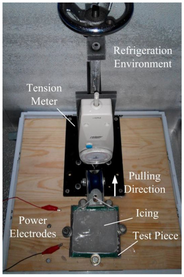 The anti-/deicing component was heated by applying a DC power device (Figure 2). A constant voltage was applied across electrodes on the two ends of the heating wire in the experiment, and the power was maintained. The deicing experiment was carried out in the refrigeration box, where the temperature was stabilized at −15 °C by the automatic constant temperature refrigeration system. The icing thickness was 15 mm according to medium icing conditions. The setting of experimental conditions was determined according to the general trial standard, and the ice thickness was chosen as the average value of the medium icing thickness range. Super-cooled water was dropped onto the surfaces of the test sample to form a predetermined icing thickness.