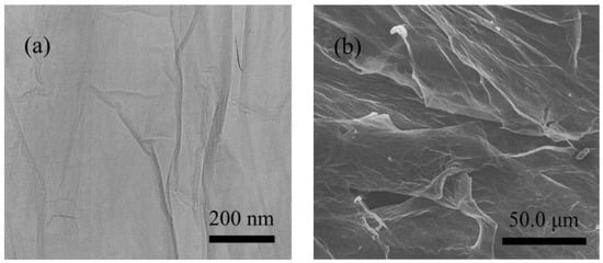 The sample structures were investigated by scanning electron microscopy (SEM, FEI Quanta 250 FEG, FEI, Hillsboro, OR, USA) and transmission electron micrographs (TEM, FEI, Hillsboro, OR, USA). Prior to SEM analysis, a thin Au layer was deposited on the specimens by sputtering. The morphologies and sizes of graphene were observed by an SEM operated at an acceleration voltage of 10 kV and standard current. The magnification was 5000. The TEM image was provided by the Jiangsu Tanfeng Graphene Technology Co. Ltd.