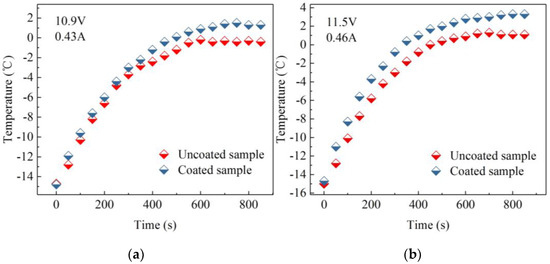 In the experiment, the selected electric voltages were 10.9, 11.5, and 12.9 V. The surface temperature of the anti-/deicing component was measured every 50 s. The heating profile of the anti-/deicing component under different heating conditions is shown in Figure 4. Comparison of the temperature curves showed that the surface temperature of the uncoated anti-/deicing component was lower than that of the graphene-coated samples in different heating conditions. With the increase in heating voltage, the surface temperature of the anti-/deicing component also increased. Under the three experimental conditions, the temperatures increased by 1.7 °C, 2.2 °C and 2.8 °C, respectively.