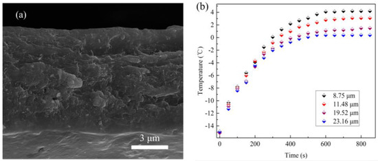 Test samples with different coating thicknesses of graphene were prepared. The effects of coating thickness on the heat transfer and anti-/deicing performance of graphene were analyzed by measuring the thickness and surface temperature in the same refrigeration environment and heating conditions as the anti-/deicing components. The thickness of graphene was measured using the SEM image, and the temperature was measured with a thermocouple. The changes in heat transfer characteristics of the graphene coating were analyzed by recording the surface temperature variation curve, as shown in Figure 6.