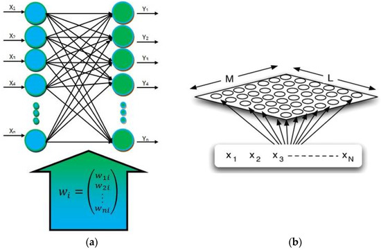 Model of (a) a one-dimensional structural model of the SOFM [35] and (b) a two-dimensional structural model of the SOFM [45].