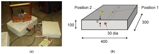 Scheme of (a) DC resistivity equipment on reinforced concrete specimen and (b) resistivity measurement locations on concrete specimen [19].