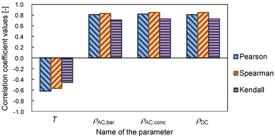 For α = 0.01, the hypothesis regarding compliance of the distribution of all the parameters with normal distribution desires to be rejected for T, ρAC,conc and ρDC (Table 3). Thus, the most useful input parameter will be the ρAC,bar and icorr as an output variable. Then, the correlations between the input parameters and icorr, were investigated using Pearson’s (p), Spearmann’s (ρs) and Kendall’s (τ) correlation coefficients (Figure 4). Parameters are considered to be useful when the values of p, ρs and τ are in a range from ±1 to ±0.4.