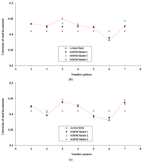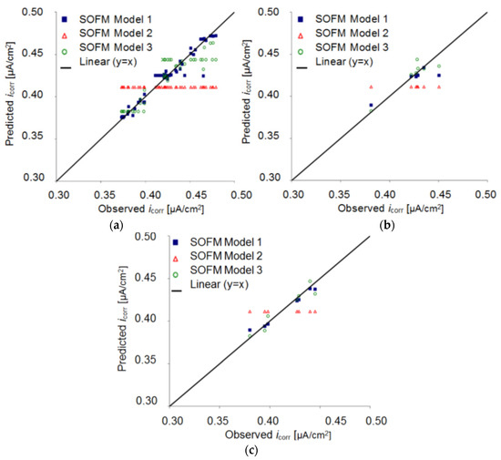 Comparison of corrosion current density prediction using the different SOFM models in the processes of (a) training, (b) validation, and (c) testing.