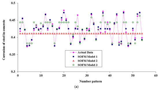 - When comparing the results of training, validation and testing of different models of a SOFM, it can be seen that the SOFM model with a 1-9-4 structure, transfer function of TanhAxon, and a momentum training algorithm has a higher ability and accuracy in predicting the corrosion current density of steel in concrete.