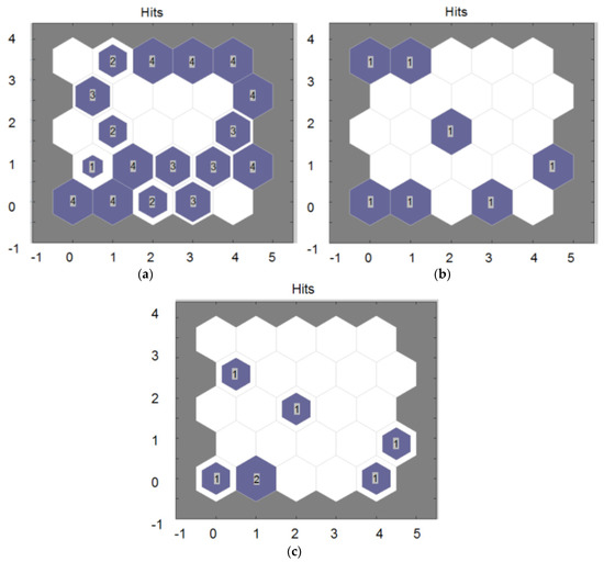 According to Table 7, parameters T and ρDC have the least and greatest impact respectively on the output of SOFM–GA Model 1. The best network for matching the input data in the SOFM–GA model is a 5 × 5 structure, which is indicated in Figure 7 for the training, validation, and testing phases.
