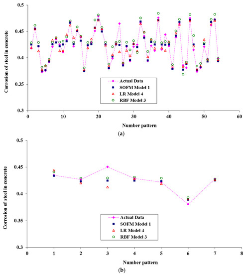3.3. Comparison of the Selected SOFM–GA Model with Linear Regression (LR) and the Radial Basis Function (RBF) Neural Network