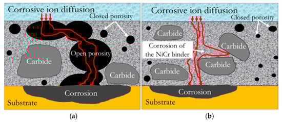 The corrosion behavior of the Cr3C2-NiCr coatings in alkaline and acidic environments has been extensively studied [,,,,,,,]. It was found that the corrosion resistance of the Cr3C2-NiCr coating is reduced by either (a) the presence of porosity, especially when the pores are interconnected [], as can be seen in Figure 1a, or (b) the presence of carbides [], as illustrated in Figure 1b. Guilemany et al. [] showed that defects such as pores and cracks play a key role in the integrity of the coating–substrate system and can negatively affect the corrosion resistance, as they act as main paths for the electrolyte to pass the coating and reach the substrate. In this case, if the substrate is more active than the coating, a galvanic pair is formed between the coating and substrate which leads to substrate corrosion, damage of the component and a decrease in the component’s lifetime [].