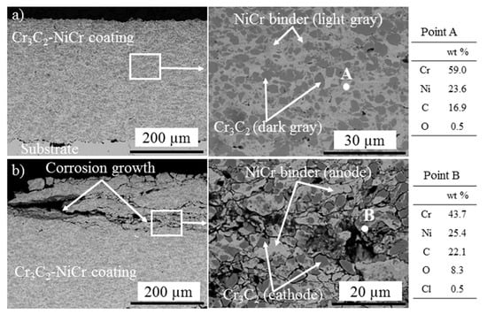 As already discussed, the corrosion behavior of Cr3C2-NiCr is affected by (a) porosity, (b) galvanic effect between the Cr3C2 and the NiCr metallic binder and (c) galvanic effect between the matrix zones of higher Cr3C2 concentration (subsequently lower NiCr concentration) and the matrix of higher NiCr concentration (subsequently lower Cr3C2 concentration) [], as can be seen in Figure 3b. Based on the EDS point analysis in Figure 3b, a high amount of O and a low amount of Cl could be detected within the corrosion paths. The HVAF-sprayed Cr3C2-NiCr coating was rather dense, thus, the contribution of pores to corrosion of the coating could be critical, whereas corrosion by the galvanic pairs could be triggered throughout the coating. The NiCr was more anodic than Cr3C2, as NiCr was corroded in the couple. Therefore, the dissolution of NiCr in the galvanic couple was expected to be dominant. Conversely, the dissolution of the Cr3C2 was expected to be hindered, owing to the cathodic protection by NiCr. This means that even if there were only closed pores in the Cr3C2-NiCr coating, corrosive ions could find their paths by corroding the NiCr metallic binder and making the pores interconnected. In this context, an intermediate layer beneath the Cr3C2-NiCr coating could address the aforementioned corrosion challenges.