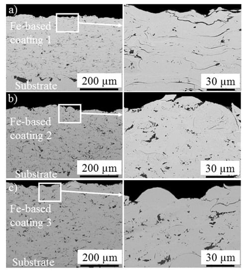 Back-scattered SEM micrographs of cross-sections of as-sprayed (a) Fe-based 1, (b) Fe-based 2 and (c) Fe-based 3.