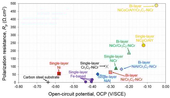 Polarization resistance (Rp) vs. open-circuit potential (OCP) of various HVAF single- and bilayer coatings in 3.5 wt % NaCl solution.