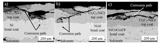 Microstructure of the corroded samples, (a) Ni/Cr3C2-NiCr, (b) NiAl/Cr3C2-NiCr and (c) NiCoCrAlY/Cr3C2-NiCr []. (Reproduced from [] with permission; Copyright 2016 Elsevier).