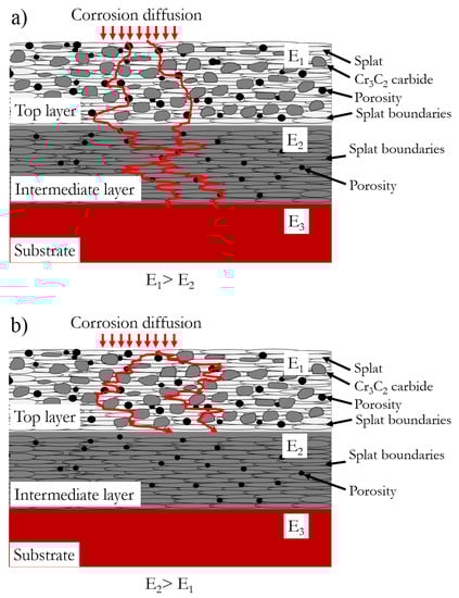 Figure 8 shows schematic views of the bilayer coatings with different configurations in terms of galvanic coupling between the top and intermediate layers. As illustrated in both cases, the OCP (or Ecorr) of the intermediate layer affects the corrosion behavior of the bilayer coatings. The OCP values are affected by composition and microstructure of the coatings []. The presence of some coating features—for example, pores, splat boundaries or in in situ oxides-reduce the OCP values, whereas Ni rather than Fe or addition of passive layer-forming elements—for example, Cr or/and Al—provide high OCP values. The severity of corrosion in a bilayer coating depends on the magnitude of the potential difference between the top and intermediate layers, defined by Equation (2):