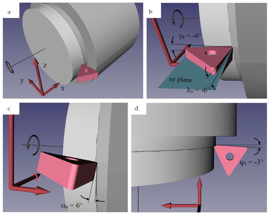 (a) Schematic view of a TNMA160408F insert and the turning geometry resulting from the use of a MTJNL2020 K 16 tool holder (Tübingen, Germany); (b) detail of the insert showing that the tool normal rake and tool cutting edge inclination are negative; (c) insert with a 6° tool normal clearance; and (d) tool lead angle of −3°. Axis: x, feed direction (Ff); y, DOC direction (FDOC); z, primary motion direction = direction of the main component of cutting force (Fc).