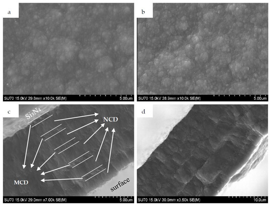 Representative top and cross-sectional SEM images of the two types of coatings, ML10x1 and ML10x2, are given in Figure 2. The free surfaces of the coatings (Figure 2a,b) present clusters of nanosized diamond particles without any crystalline facets as described for similar diamond multi-layered coatings [18]. The cross-sections obtained by fracture (Figure 2c,d) depict the multi-layered structure of the coatings, the MCD layers being much thinner than NCD. For the ML10x1 coatings, each MCD layer is about 0.7 µm thick while the NCD thickness is 1.7 µm. These values are nearly double for the ML10x2 coatings. This coating architecture relies on the strong adhesion of a first layer of MCD to the plasma etched Si3N4 ceramic substrate [22] and on the insertion of intermediate MCD layers creating MCD/NCD interfaces that act as energy sinks to crack propagation [19]. The top layer is of NCD to ensure a smoother surface, Ra (ML10x1) = 79 ± 7 nm and Ra (ML10x2) = 145 ± 6 nm, relatively to uncoated, etched substrates, or to substrates coated solely with MCD [18]. Thick NCD layers combined with thin MCD layers act in a way that further contributes to reduce the surface roughness of the tools. The larger surface roughness of the thicker coating (ML10x2) is merely a consequence of the larger thickness of the MCD and NCD layers in the ML10x2 inserts.