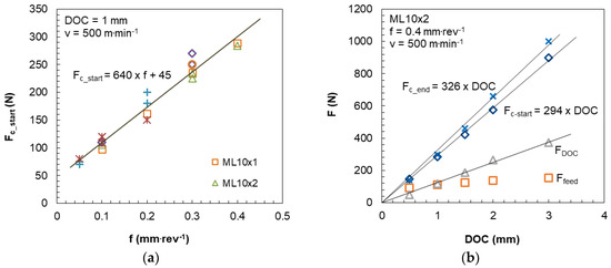 (a) Variation of the initial values of the main cutting force with feed (f), at fixed DOC and cutting speed.