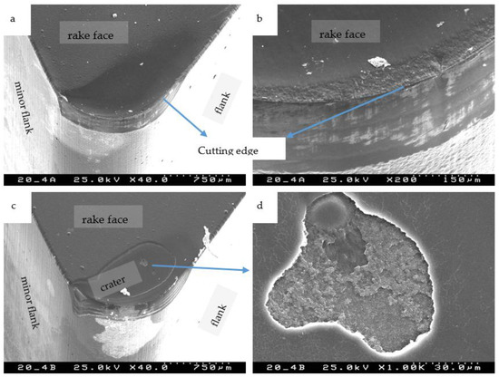 (a) SEM micrographs of the ML10x2 cutting inserts after machining at v = 500 m·min−1, DOC = 1.0 mm, f = 0.3 mm·rev−1: (a,b) L = 1975 m (four pass, dry ); (c,d) L = 1878 m (four pass, lubricated).