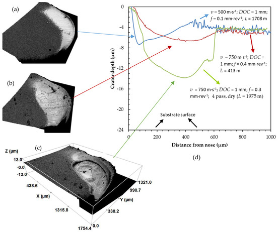 (a–c) Stacked image obtained by optical profilometry of the rake face near the nose of the inserts after machining under different turning conditions; (d) Graphic with depth profiles across the wear crater, from the nose of the tool towards the centre of the triangular inserts.