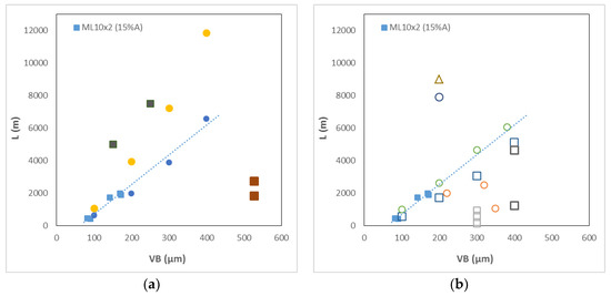 Tool machining length given as a function of flank wear of diamond tools (squares for CVD coated inserts, circles for PCD inserts and triangle for brazed thick CVD; filled symbols—workpiece material contains Al2O3; open symbols—reinforcing particles are SiC; dotted line corresponds to an extrapolation of ML10x2 results (filled blue squares). (a) ■—CVD/15% Al2O3, present work; ■—CVD/10% Al2O3 [14]; ■—CVD/10% Al2O3 [6]; ●—PCD/10% Al2O3 [2]; ●—PCD/20% Al2O3 [2]; (b) ■—CVD/15% Al2O3, present work; □—CVD/20% SiC [16]; □—CVD/20% SiC [2]; □—CVD/20% SiC [6]; ◯—PCD/20% SiC [2]; ◯—PCD/20% SiC [6]; ◯—PCD/20% SiC [23]; △—Thick CVD/20% SiC [6].