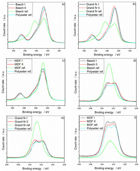 Comparison of XPS measurements of untreated reference, single-, double-coated and polyester reference: (a) C1s European beech; (b) C1s Grand fir; (c) C1s MDF; (d) O1s Beech; (e) O1s Grand fir; (f) O1s MDF.