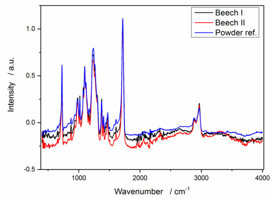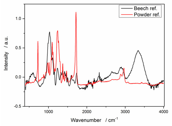 FTIR spectra of uncoated European beech and the powder reference.