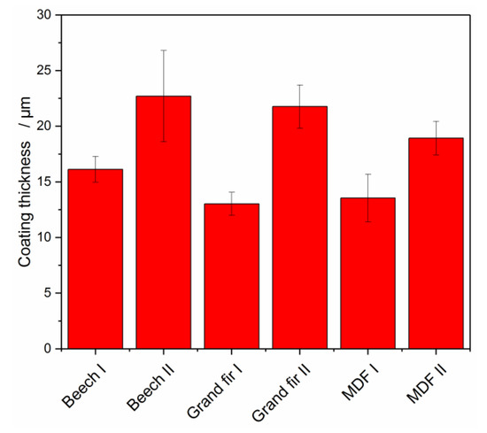 LSM data showing the coating thickness of single- and double-coated European beech, Grand fir and MDF (N = 10).