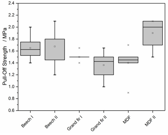 The dolly test showed that, apart from a statistical outlier, the required practical minimum pull-off strength of 1 MPa could be achieved. Figure 7 displays the distribution of the dolly test measurement as a box plot. The pull-off tests on most of the coated Grand fir samples did already show a cohesion failure. For MDF samples only cohesion failures occurred. Therefore, the lift-off strength might be partially above the values shown in Figure 7.