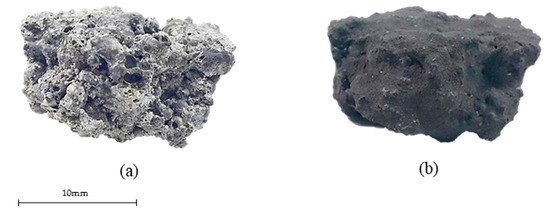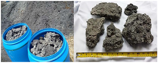 Malaysia is one of the primary producers of palm oil, contributing more than half of the world’s palm oil on a yearly basis [5]. In 2012, it was reported that the total production of crude palm oil was more than 18.7 million tons [6]. The extraction of useful material from these plants generates various types and forms of waste material, which need to be disposed of appropriately. Generally, they comprise of ash, grains, wastewater, and shells in large combined chunks [7]. POC is a palm oil shell incineration by-product in the form of a lightweight material (Figure 1). The large chunk of POC is flaky, irregularly shaped, and porous with a rough and sharp broken surface, as seen in Figure 2. POC, when crushed, represents a lightweight aggregate that can be potentially used in concrete production [8]. Kanadasan et al. (2015) [9] reported that the similarity of the particle size distribution and the grading features of sand and POC fine aggregate indicate the suitability of POC fine as a suitable substitution for sand in concrete production. Abdullahi et al. (2008) [10] prepared trial mix proportions for POC, and showed that it is possible to use POC as an aggregate in the mix design of concrete without adding admixture. Kanadasan et al. (2014) [7] reported that POC aggregates, which are often seen as a waste material for landfilling, performed satisfactorily as an aggregate material in the production of self-compacting concrete. Also, a study conducted by Ibrahim et al. (2016) [11] indicated the feasibility of incorporating POC aggregate as a suitable replacement for natural aggregates in Pervious Concrete (PC) production. In this study, palm oil clinker powder (POCP) was used as a filler material to fill up and coat the surface voids of POC coarse so as to enhance the engineering properties of normal grade POC concrete. The aim was to examine the applicability of palm oil waste as a natural aggregate replacement in concrete production towards improving the sustainability of the construction industry.