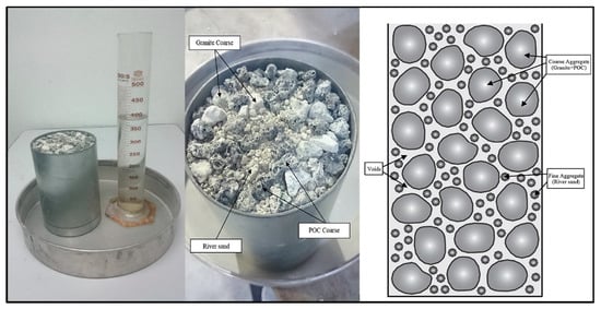 POC, being highly porous, and due to no standard guidelines available in literature on how to choose the quantity of powder required to coat the surface voids of such an aggregate, the particle packing (PP) method was adopted to determine the volume of voids due to the porosity of POC at different substitution levels. The PP method gives an assessment of the additional voids when POC is substituted with the natural aggregate. The steps for using the PP method to measure the voids are as follows: