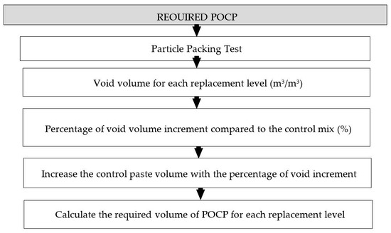 To determine the particle packing density of concrete, small particles should be selected to fill up the voids between the large particles [14]. In this study, palm oil clinker powder (POCP), which was obtained by a ball mill grinding process of POC, was selected as the suitable filler material to coat the surface voids of POC coarse in order to enhance the fresh and hardened properties of the POC concrete. It is important to design concrete structures and mixtures in such a way that any negative environmental impact is minimized. Thus, using POCP serves as an environmentally friendly alternative and is also a means of maximizing the use of palm oil waste in the concrete. The general procedure for determining the POCP required for each substitution level of POC coarse is shown in Figure 6, and the detailed calculations are given in Appendix A.