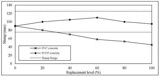 The consistency of the concrete was assessed by the measure of slump in this study. Slump results of the POC and POCP concrete mixes are depicted in Figure 9. The workability of the mixes was affected by incorporating the POC coarse. Increasing the substitution ratio of POC decreased the workability of the mix. The mixes up to a 40% replacement of POC achieved the target slump range of 100 ± 25 mm. Meanwhile, the mixes with more than 40% of POC coarse were found to be less cohesive, having a high segregation and being somewhat harsher than the corresponding conventional concrete. The reduction of workability can be attributed to the particle shape and rough surface, as well as the sharp broken edges of POC. The irregular shape of POC resulted in a higher surface area increasing the demand for extra paste volume to ensure a good workability and to avoid segregation. Based on the experimental study by Koehler and Fowler (2007) [15], they concluded that the workability of a mix is a function of the aggregate characteristics, the paste volume, and the rheology of the paste. However, it is obvious that the workability of the POCP concrete was improved when the addition of POCP was used as a filler material to fill up the voids of POC particles. The observed improvement in workability can be partly attributed to the higher paste volume that makes the concrete cohesive enough to be handled without segregation or bleeding. The POCP helped to coat the POC particles, filling the gaps between the aggregates, thereby providing a better chance for aggregate lubrication. It can be seen that the mixes incorporating a higher content of POC coarse tend to require a higher POCP content to give extra lubrication to the POC aggregate, as well as higher dosages of SP to make the mixes more cohesive and to achieve target slump range of 100 ± 25 mm.