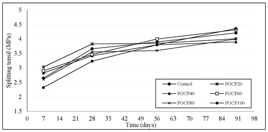 Nevertheless, the obtained tensile strength of the POCP concrete was always higher than the minimum recommended by ASTM C330 for structural lightweight concrete, which is 2 MPa. Previous studies [20,21,22] reported that the 28 days splitting tensile strength of lightweight concrete ranged between 1.10 and 2.41 MPa for moist cured concrete. In general, lightweight concrete with cube compressive strengths of 50, 40, and 30 MPa has a splitting tensile strength in the range of 2.5–3.8, 2.2–3.3, and 1.8–2.7 MPa, respectively [23]. However, the measured splitting tensile strength of POCP concrete in this study was in the range of 3.23–3.82 MPa at 28 days, which is higher than the values reported in previous studies on lightweight concrete.