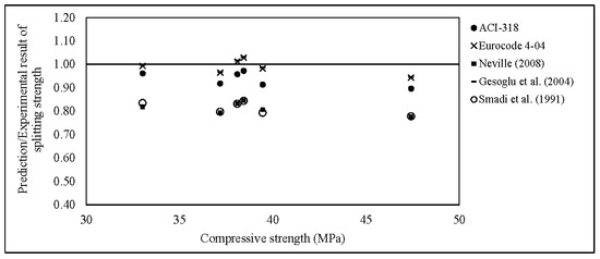A parabolic relationship with a correlation coefficient of 0.86 was observed between the 28-day compressive strength and splitting tensile of the POCP concrete, as shown in Figure 19. Figure 20 shows the comparison between the splitting tensile strength predicted by various equations listed in Table 6 and the experimental values. Equation (1) was proposed based on the results in this study for the POCP concrete. All equations with their descriptions are tabulated in Table 6. It can be seen that the equation of POCP concrete in this study is different from the equations proposed in previous studies due to the usage of a different type of aggregate in the mixtures and its physical properties. Additionally, Figure 20 revealed that the predicted splitting tensile from compressive strength of the POCP concrete is close and comparable with the Equations of (2) and (6), and overestimation than that of Equations (3)–(5).