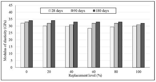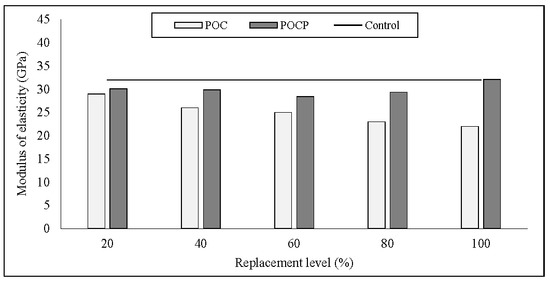 Modulus of elasticity (MOE) was conducted according to BS 1881: Part 121 on the cylinder specimens with a dimension of 150 mm diameter × 300 mm length. The results of the MOE of the concrete specimen containing different replacement levels of POC coarse with and without POCP are shown in Figure 23. Both POC and POCP concrete had a 28-day MOE ranging between 22 and 32 GPa, and the 28-day compressive strength ranged between 33 and 51 MPa. The incorporation of POC coarse negatively affected the MOE values of concrete. The results revealed that the MOE of the POC concrete was 9% to 31% lower than the control mix. Often, the quality of the coarse aggregate greatly affects the elastic modulus. A comparison between the MOE values of the POC and POCP concrete before and after coating at 28 days showed that the addition of POCP had a significant effect on the MOE of the POC concrete. POCP concrete had a 28-day MOE range between 28 and 32 GPa, which is 14%–46% higher than that of POC concrete (pre-coating). Furthermore, the addition of POCP resulted in the decreasing of the water to powder ratio, which benefited the elastic modulus property. Krizova et al. (2004) [33] studied the influence of the water-binder ratio on the static modulus of concrete and reported that using a lower volume of mixing water reduced the number of cracks created by drying, and consequently improved the elastic modulus.