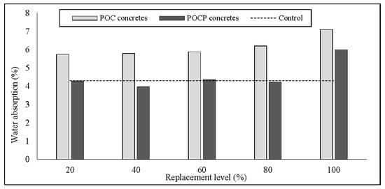 - POC concrete mixes had higher water absorption when compared to the control mix and tends to rise with an increasing POC coarse contents. However, the addition of POCP resulted in a decrease in the value of water absorption when compared to the POC concrete by reducing the pore size, which resulted in highly densified paste.