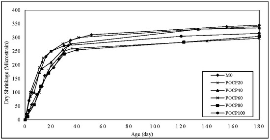 The increase in the MOE values of the POCP concrete with respect to the POC concrete mixes can also attributed to the enhancement of the interfacial transition zone. Domagała et al. (2011) [34] reported that for LWAC, a strong bond was formed between the cement matrix and aggregate due to the higher water absorption of LWA and its rough texture, resulting in a higher modulus of elasticity. Also, the rough surface texture further ensured that the bond between the surrounding hydrated cement paste and aggregate was better, thus improving the mechanical properties of the concrete [34]. The development of the MOE values of the POCP concrete up to 180 days is shown in Figure 24.
