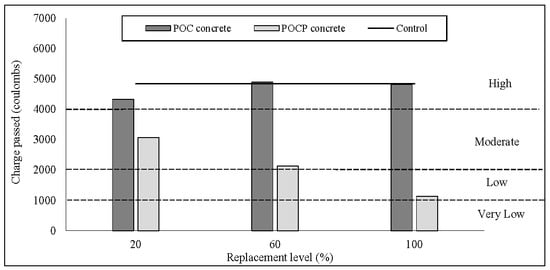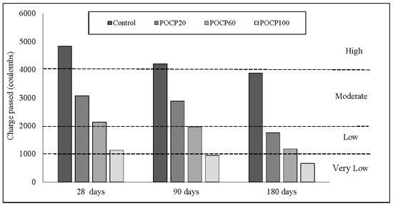 - Specimens containing additional POCP exhibited a greater chloride-ion resistance as compared to POC mixes, as well as to the control concrete. At 28 days, the charge passed of the POCP concrete was in the range of 12% to 70%, lower than that the POC concrete.