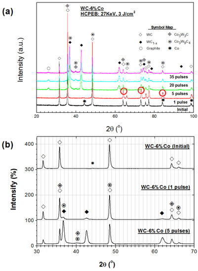 Figure 2 shows the glancing-angle X-ray diffraction traces observed from the samples before and after the different number of HCPEB irradiation. Consistent with the analysis given in Figure 1, only the peaks corresponding to the WC (hcp) and Co (hcp) were revealed for the initial materials. After one pulse of HCPEB irradiation, the Co peaks were weakened and some WC peaks (circled in red) were intensified. The changes were related to the surface evaporation of Co and the transformation of melted Co with WC into Co3W9C4 and Co3W3C after HCPEB irradiation [17]. It is also worth noting that the WC peak splitting at around 2θ ~75° suggested the formation of the fcc WC1−x after HCPEB.