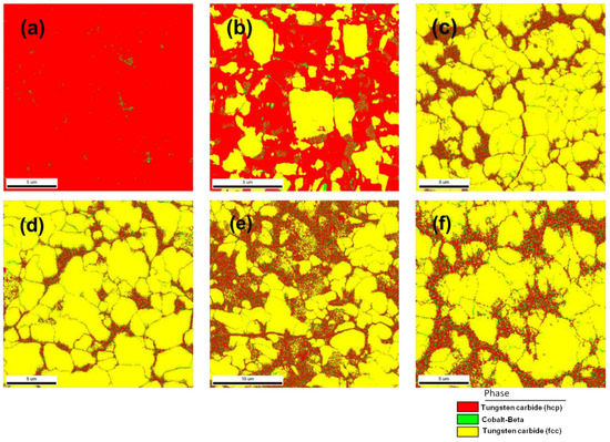 Figure 1a is an EBSD phase map showing that the WC carbide has a prismatic shape and a size ranging from 1.2 to 5 µm. WC was sintered by equilibrium hexagonal close-packed (hcp) structures, while the green areas between the red WC blocks are indicated as Co. This Co + WC mixture is better seen in the TEM bright field image in Figure 1c, where the WC is prism-like blocks having sharp angles. Figure 1b is an EBSD orientation map of the same area as shown in Figure 1a; it is revealed that each WC block corresponds to a single grain and that the orientation differences existing in the large WC particles are very small.