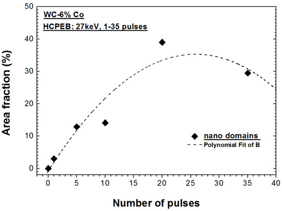 Area fraction evolution of nano domains on the surface of WC-6% Co hard alloy as-treated by HCPEB with increasing pulse numbers.