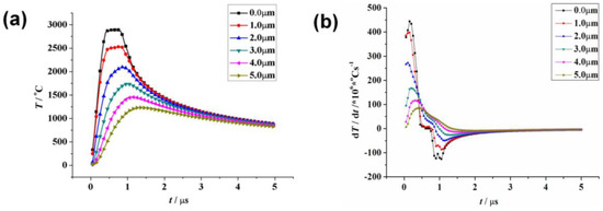 Figure 8 gives the temperature and the temperature gradient variation as a function of time at different layers from the surface after a single pulse of HCPEB irradiation. According to the simulation, the surface temperature could get as high as 3200 K within 0.7 µs and then go down to ~1273 K after 4 µs. As the surface temperature is slightly higher than the melting point of tungsten carbide (~3100 K [23]), those would get partially melted at the sample surface after one pulse of HCPEB irradiation; this was proved by the previous experimental observations [17]. It is also worth noting that the surface temperature got down to ~1273 K sharply within 4 µs (seen in Figure 8a), which is much lower than the reported melting point of WC-Co (~1573 K) [23]. Considering the pulse interval (~10 s) of the present experimental setting, it suggests that the surface got enough time for cooling and solidification within a single pulse of irradiation. This conclusion is very important for the analysis of the surface metastable microstructure transformation. Further, as seen from Figure 8b, the maximum heating rate and the maximum cooling rate at the sample surface were as 4.5 × 108 K/s and 1.26 × 108 K/s, respectively.