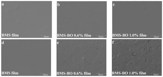 Surface SEM images of the (a) BMS film, (b) BMS-BO 0.6% film, and (c) BMS-BO 1.0% film. Cross-sectional SEM images of the (d) BMS film, (e) BMS-BO 0.6% film, and (f) BMS-BO 1.0% film. Magnification: 3000× and 2000× for surface and cross-section, respectively.