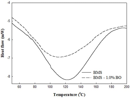 It is clear that BO incorporation affected the Tm and ΔH of the film. In particular, the addition of BO decreased Tm. The Tm of the BMS films with 1.0% BO was 110 °C, lower than that of the control BMS film (122 °C). The decrease in Tm of the films is mainly due to the weakened network of starch and BO. It appears that BO in the film-forming solution could interact with starch polymers and occupy space in the helical amyloses, reducing the interactions between starch polymers and weakening the film network. As a result, the ΔH of the films decreased from 148.66 J/g for the BMS film to 116.64 J/g for the BMS films with 1.0% BO. This decrease in ΔH indicates decreased thermal stability of the BMS films containing BO. Similarly, Jaramillo et al. reported decreases in Tm and ΔH of cassava starch films supplemented with yerba mate extract [37]. In this study, the incorporation of BO decreased firmness and increased flexibility of the BMS films, and the energy required for melting the film was lesser than that required for the BMS film without BO. Therefore, these results are consistent with the decreased TS and increased E of the BMS film containing BO.