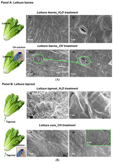 The arrows in Figure 3A(c,d) indicated the stomatal aperture partially covered by the CH coating. The FESEM images underlined a well distributed and homogeneous coating on the lettuce leaves, as well as the lettuce taproot (Figure 3B(c,d)) with the typical tri-dimensional porous structure as reported and discussed in Figure 1c–f (see inset in Figure 3B(d)). The FESEM images also underlined that, although the CH coating was well distributed on the vegetable’s surface, it should not negatively affect the food product functionality since the stomatal aperture was quite evident after the application of the coating, guaranteeing the normal breathing of the food due to the porous structure of the applied CH coating.