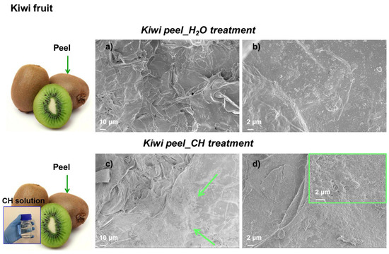 Comparable results were also obtained for kiwifruit peel treated with the CH coating and always compared with water-treated kiwifruit products, used as a control (Figure 4). FESEM images underlined the well-obtained distribution of CH coating that perfectly adhered and covered the kiwifruit peels (see arrows in Figure 4c,d) maintained, also in this case, the porous structure (see inset in Figure 4d). Furthermore, although in all cases a thin film (less than 3–5 μm) was obtained due the low molecular weight of the selected commercial-grade polymer, the coating was able to thoroughly seal lettuce and kiwifruit peels, potentially guaranteeing good conservation of the food products.