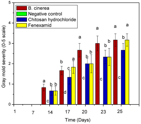 More specifically, for kiwifruit, the wounds, normally caused by detachment from the plant during harvest, were simulated by a cut with a sterile scalpel at the petiole. Then, fruits were immediately immersed for 30 s in a bath containing the chitosan hydrochloride solution, or the other active ingredients chosen for the comparison, or pure water as a control. According to the market analysis, Fenhexamid, as chemical active ingredient present in the most used commercial formulation (Teldor® Plus, New Boston, NH, USA) was selected and utilized, dissolved in water at the commercially-suggested dose (1.2 g/L) for comparative treatment. Then, 100 μL aliquots of a suspension containing 1 × 106 conidia/mL of B. cinerea in sterile distilled water, as assessed by a Thoma cell counting chamber, were distributed by pipette on the surface of the cut petiole. Inoculated fruits were then transferred into a storage box at 4 °C. Six homogenous fruits were used per each treatment: chitosan solution, one commercial formulation, and SDW for both positive (inoculated fruits) and negative (not inoculated fruits) controls, for a total of 30 fruits. The entire experiment was repeated twice. The effectiveness of treatments was evaluated by means of a quantitative scale for gray mold severity, in which 0 is for totally healthy fruits, 1 is for fruits with 1%–20% surface damage, 2 is for fruits with 21%–40% surface damage, 3 is for fruits with 41%–60% surface damage, 4 is for fruits with 61%–80% surface damage, and 5 is for fruits with >81% surface damage. Fruits were examined and data collected at 1, 7, 14, 17, 20, 23, and 25 days after inoculation. Data were statistically analyzed by Tukey’s HSD multiple comparison test with p = 0.01.
