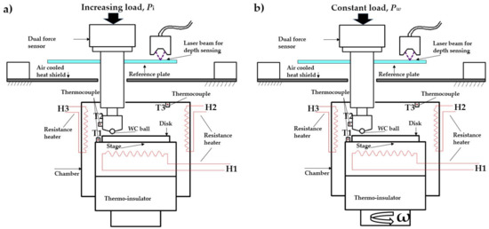 Schematic of the joint test rig for high temperature micro-indentation and wear test: (a) for indentation test; (b) for wear test.