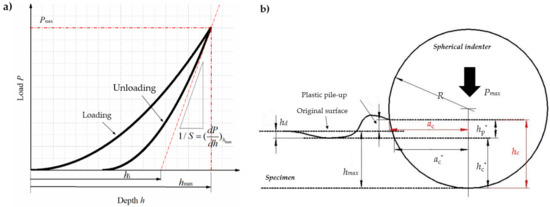 - Kim, S.H.; Lee, B.W.; Choi, Y.; Kwon, D. Quantitative determination of contact depth during spherical indentation of metallic materials—A FEM study. Mater. Sci. Eng. A 2006, 415, 59–65. [Google Scholar] [CrossRef]