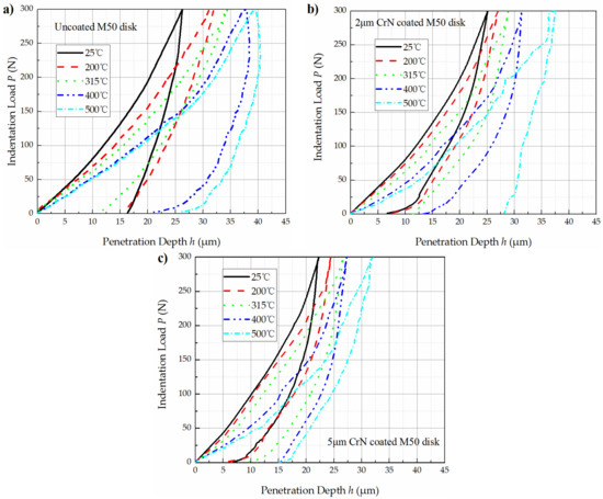 Elevated temperature indentation test results of uncoated M50 disks, 2 μm CrN coated M50 disks and 5 μm CrN coated ones are shown in Figure 3.